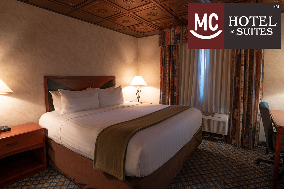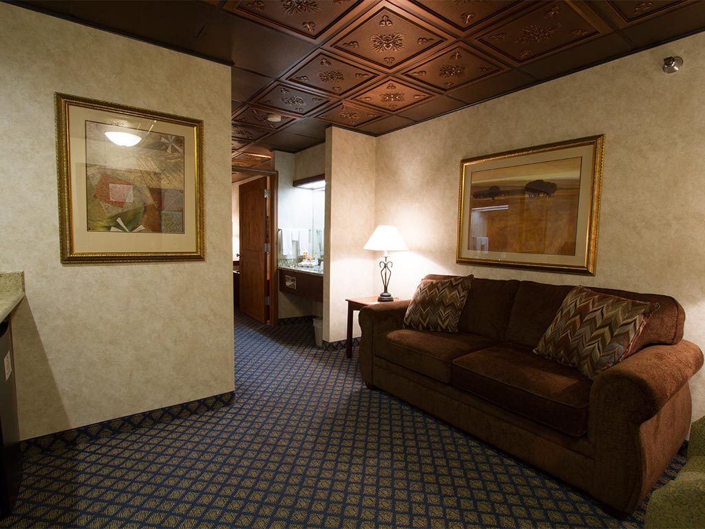 The luxurious Ambassador Suites provide the privacy of two rooms that offer 277 square feet of personal space that is separated by a stylish locking door. The bedroom features a king size bed, nightstands, large flat screen TV and a very large dresser with generous drawers. Like the Presidential Suite, the Ambassador Suites offer the very finest décor in our hotel: inlaid copper tile ceiling, custom light fixtures, perfectly hand-glazed walls and unique pieces of enthralling art. These suites truly provide our guests with a superb experience during their stay. Room amenities include: Luxurious king size bed, large couch that unfolds into a comfy queen size bed, an overstuffed chair, 2 big screen flat TVs, refrigerator, microwave oven, writing/computer desk with an executive desk chair, full-length mirror, an iron and ironing board, hair dryer, coffee maker and personal care products. These suites are favorites for guests who will be with us for a visit of 2-days or more.